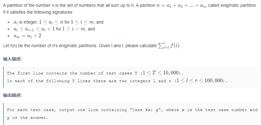 数$n$的拆分,要求最大值与最小值相差为2,且相邻两个数之间相差小于1,$f[i]$表示拆分的个数。 有T组测试,每组给出l和r,求出$\sum_{i=l}^rf[i]$。