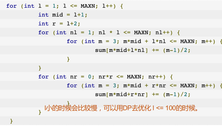 根据标程给的题解,它是枚举$l$,所以这三个数为$l,l+1,l+2$,表示为$l,mid,r$,我们知道两个$mid$可以拆成$l和r$,所以当有$m$个$mid$的时候,就有$(m-1)/2$中拆法,例如:(下面三个数字分别为$l,mid和r的个数$) $m=5:有2种拆法$ $1,2,1$ $2,0,2$ $m=8:有3种拆法$ $1,5,1$ $2,3,2$ $3,1,3$