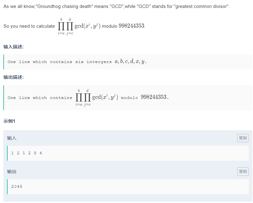 $求\prod_{i=a}^b\prod_{i=c}^dgcd(x^i, y^j) mod998244353的值$