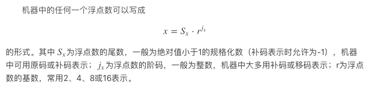 式中,S为尾数,j为阶码,r是基数。在计算机中,基数可取2、4、8、16等。 为了提高数据精度以及便于浮点数的比较,在计算机中规定浮点数的尾数用纯小数形式。将尾数最高位为1的浮点数称为 规格化数。浮点数表示成规格化形式后,其精度最高。