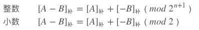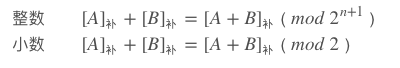 [x]_补=\left{\begin{matrix} x& 1>x \ge 0& \ 2+x,& 0>x \ge -1(mod\;2^{n+1}) & \end{matrix}\right.